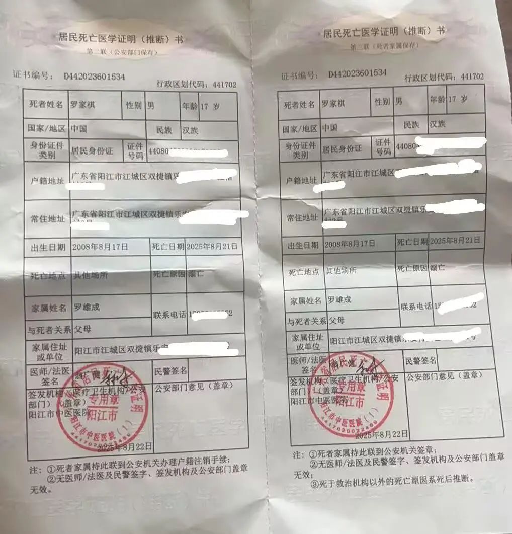 8月25日,来自广东省阳江市江城区双捷镇的梁女士,眼泪止不住地流。原来,就在几天前,即将在今年9月读高三的罗家祺在勇救一名落水的婆婆时不幸溺亡,他的生命永远定格在这个傍晚。